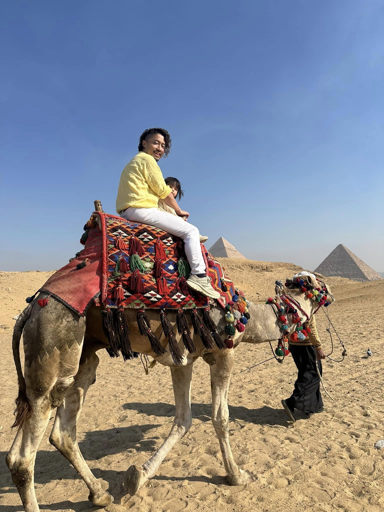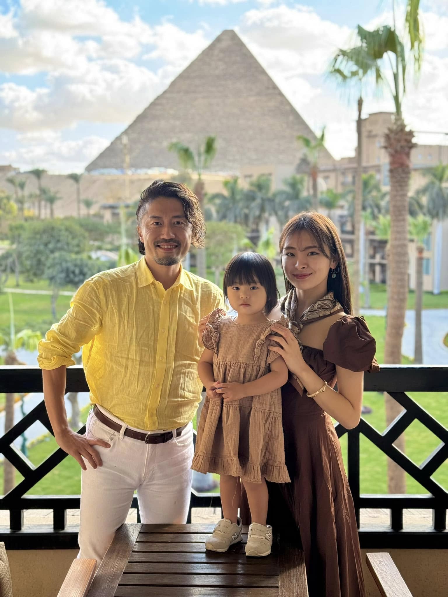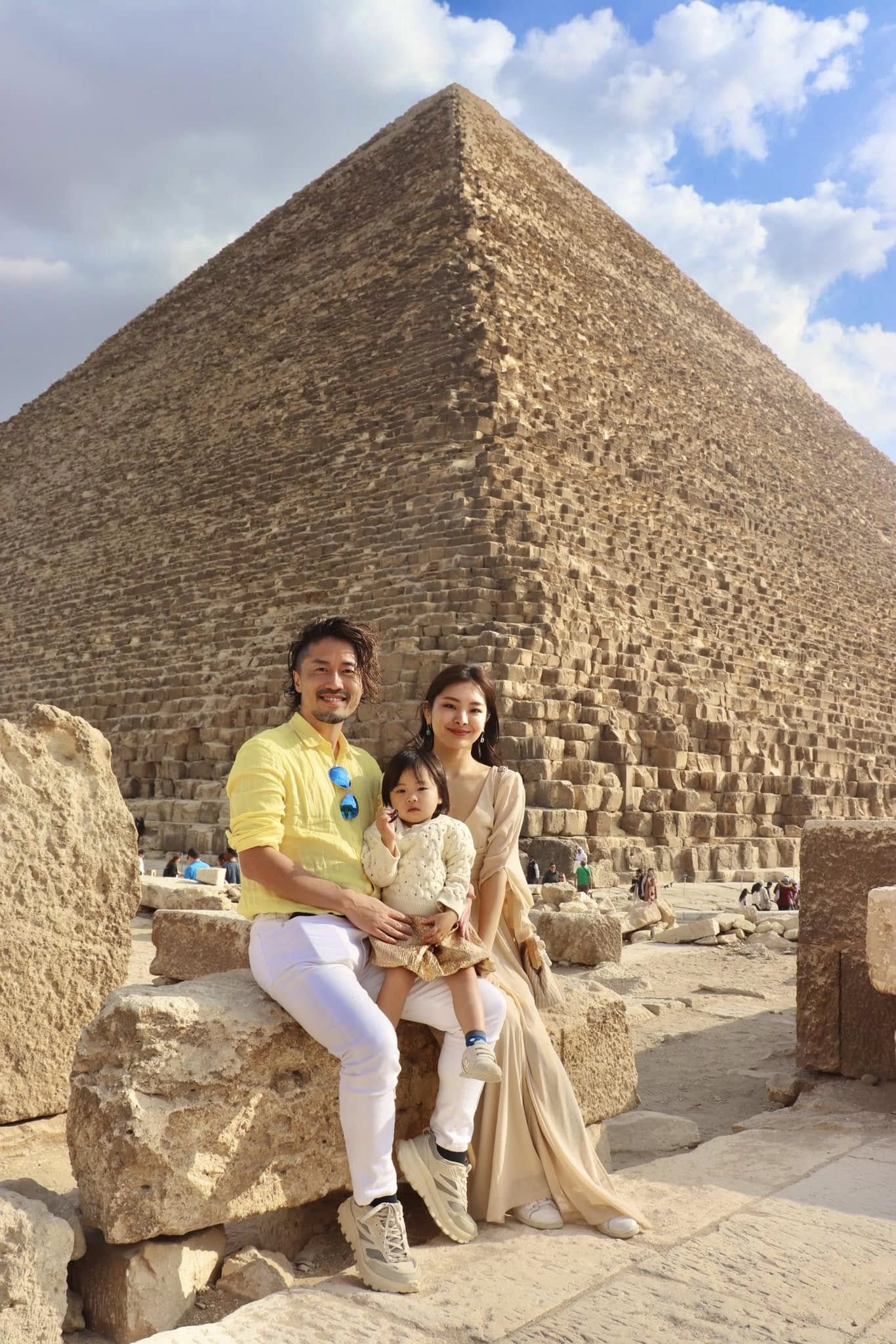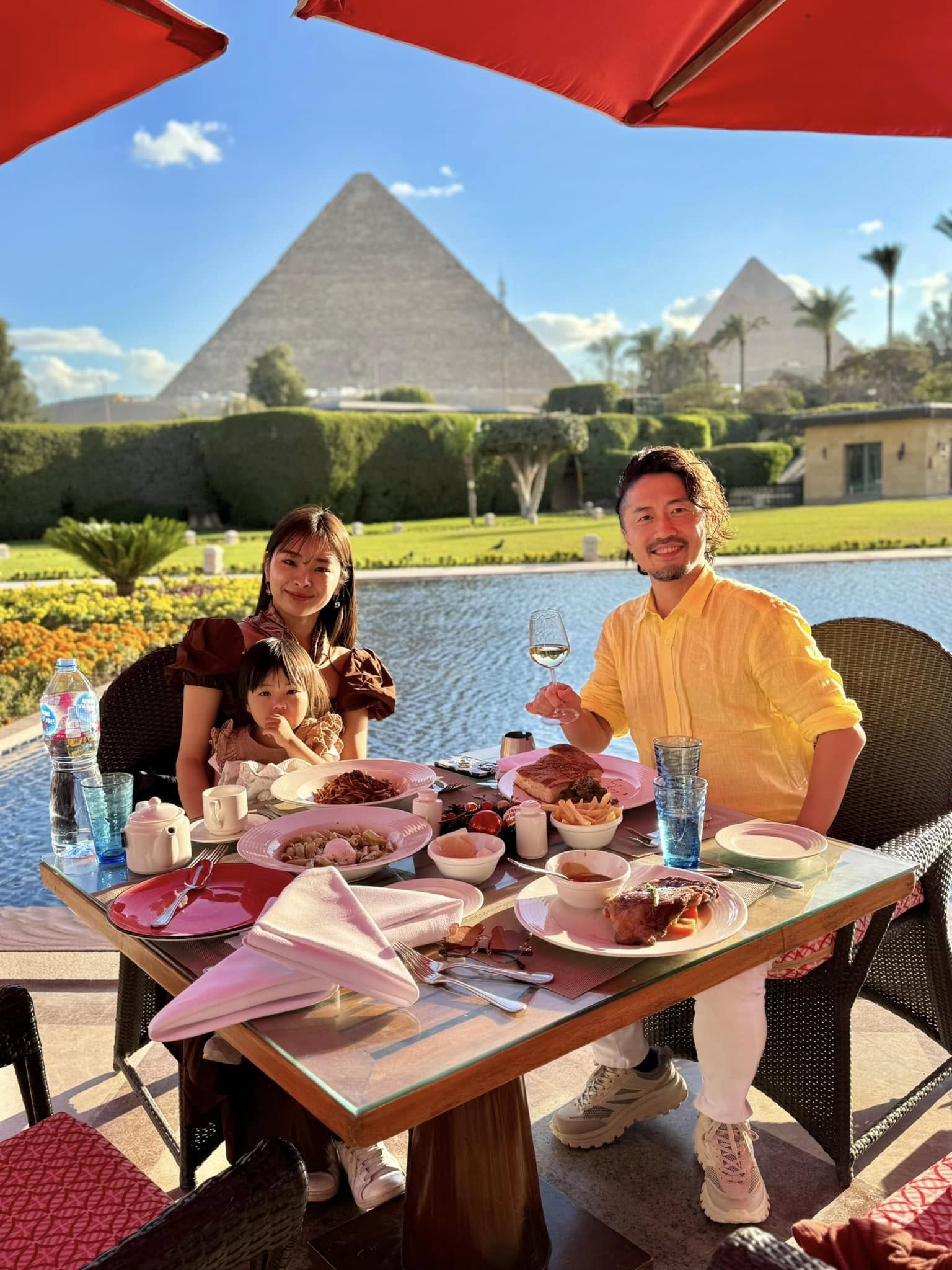 家族でピラミッドを見ながら、